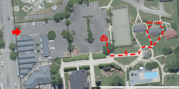 Please drive down Conical Hill Road towards Conical Hill and turn right just after Kjole Style - 5 Conical Hill Road. There is a large driveway that leads to the Hanmer Springs Hotel carpark. Please park your vehicle in the Hanmer Springs Hotel parking area (near the tennis courts as shown on the below image).