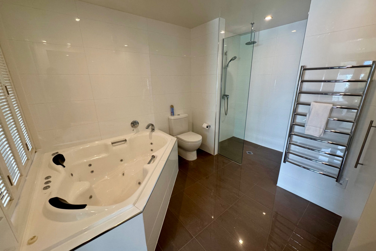 The master bedroom is huge and has a full size walk in wardrobe with plenty of drawer space. The king size bed has quality bedding and feather blankets to snuggle under plus there is a dual electric blanket. There is a TV, bedside cabinets, a small table with two chairs plus an ottoman sitting invitingly in the bay window. Large double doors open out to the front balcony. The ensuite to the master bedroom is sumptuous. It is very large and features artwork and a full size double spa bath. Just imagine being able to lie back and view the night sky through the open double bi-fold windows - very romantic. There is a large double shower with two shower roses (standard and rain shower rose), twin vanity basins, a huge heated mirror, two heated towel rails and a hair dryer.